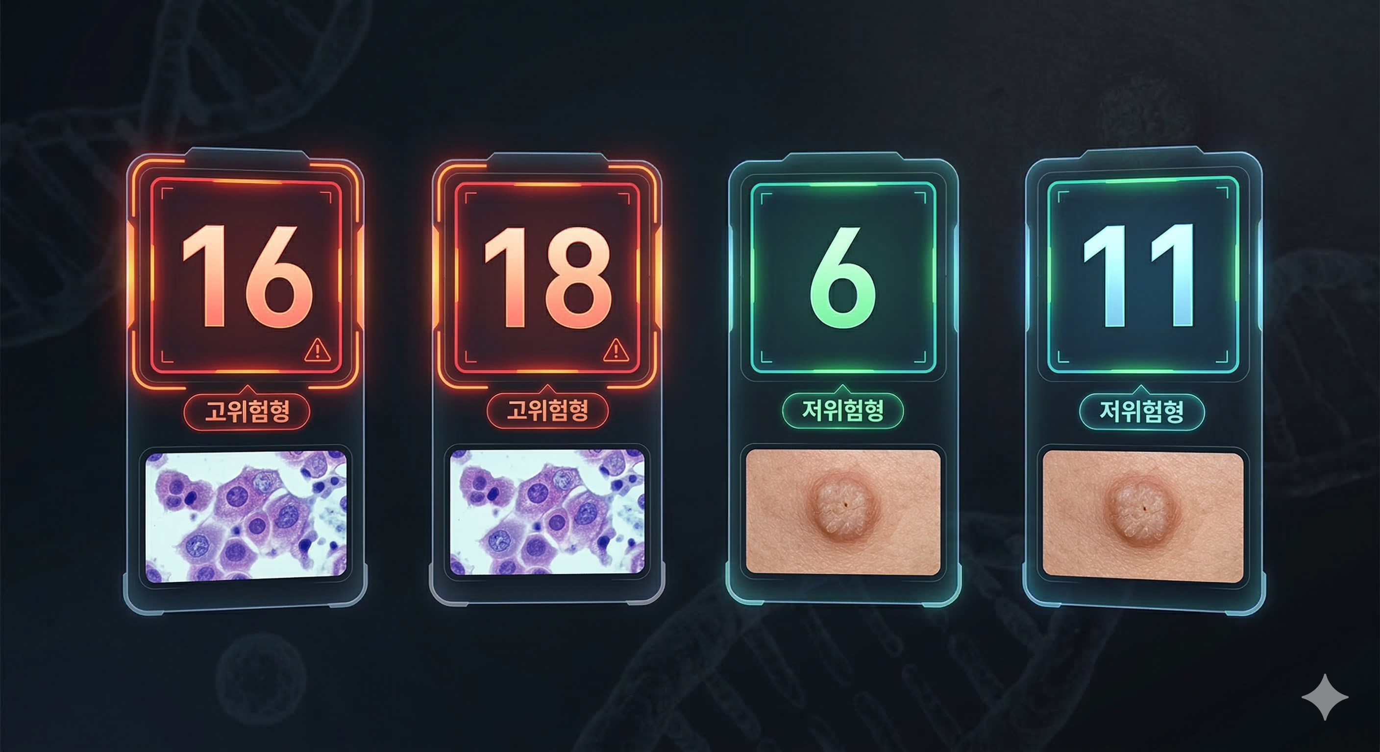 “200개가 넘는다”는 얘기를 들으면 바로 포기하고 싶죠. 그래서 딱 4개만 잡고 갑시다. 16·18은 대표적인 고위험형, 6·11은 대표적인 저위험형(사마귀 쪽)으로 자주 언급됩니다.